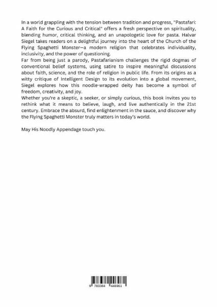 In a world grappling with the tension between tradition and progress, "Pastafari: A Faith for the Curious and Critical" offers a fresh perspective on spirituality, blending humor, critical thinking, and an unapologetic love for pasta. Halvar Siegel takes readers on a delightful journey into the heart of the Church of the Flying Spaghetti Monster-a modern religion that celebrates individuality, inclusivity, and the power of questioning.Far from being just a parody, Pastafarianism challenges the rigid dogmas of conventional belief systems, using satire to inspire meaningful discussions about faith, science, and the role of religion in public life. From its origins as a witty critique of Intelligent Design to its evolution into a global movement, Siegel explores how this noodle-wrapped deity has become a symbol of freedom, creativity, and joy.Whether you're a skeptic, a seeker, or simply curious, this book invites you to rethink what it means to believe, laugh, and live authentically in the 21st century. Embrace the absurd, find enlightenment in the sauce, and discover why the Flying Spaghetti Monster truly matters in today's world.