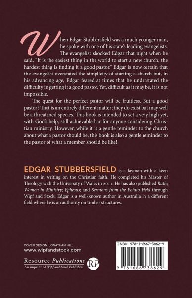 When Edgar Stubbersfield was a much younger man, he spoke with one of his state's leading evangelists. The evangelist shocked Edgar that night when he said, ""It is the easiest thing in the world to start a new church; the hardest thing is finding it a good pastor."" Edgar is now certain that the evangelist overstated the simplicity of starting a church but, in his advancing age, Edgar feared at times that he understated the difficulty in getting it a good pastor. Yet, difficult as it may be, it is not impossible. The quest for the perfect pastor will be fruitless. But a good pastor? That is an entirely different matter; they do exist but may well be a threatened species. This book is intended to set a very high yet, with God's help, still achievable bar for anyone considering Christian ministry. However, while it is a gentle reminder to the church about what a pastor should be, this book is also a gentle reminder to the pastor of what a member should be like!