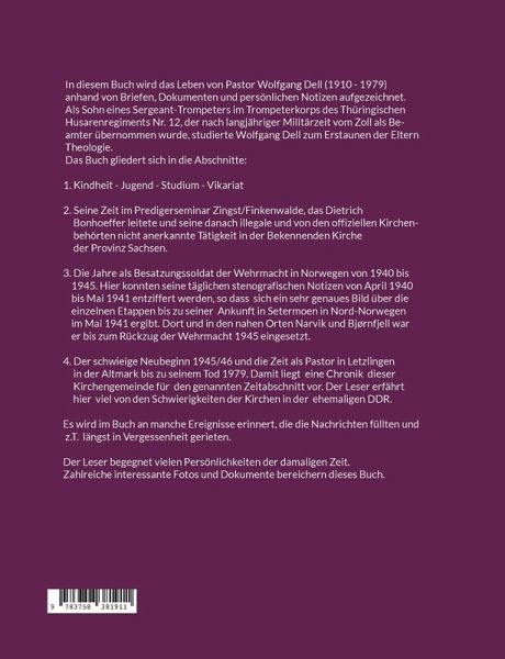 In diesem Buch wird das Leben von Pastor Wolfgang Dell (1910 - 1979) anhand von Briefen, Dokumenten und persönlichen Notizen aufgezeichnet. Als Sohn eines Sergeant-Trompeters im Trompeterkorps des Thüringischen Husarenregiments Nr. 12, der nach langjähriger Militärzeit vom Zoll als Beamter übernommen wurde, studierte er zum Erstaunen der Eltern Theologie.Das Buch gliedert sich in die Abschnitte:1. Kindheit - Jugend - Studium - Vikariat2. Seine Zeit im Predigerseminar Zingst/Finkenwalde, das Dietrich Bonhoeffer leitete, und seine anschliessende Tätigkeit in der Bekennenden Kirche der Provinz Sachsen. Es werden noch einmal die Auseinandersetzungen zwischen den NS-nahen Deutschen Christen und der Bekennenden Kirche deutlich.3. Die Jahre als Besatzungs-Soldat der Wehrmacht in Norwegen von 1940 - 1945. Hier konnten seine täglichen stenografischen Notizen von April 1940 bis Mai 1941 entziffert werden, so dass sich ein sehr genaues Bild über die einzelnen Etappen bis zu seiner Ankunft in Setermoen/Nord-Norwegen ergibt. Dort und in den nahen Orten Narvik und Bjørnfjell war er bis zum Rückzug der Wehrmacht 1945 eingesetzt.4. Der Neubeginn 1945/46 und die Zeit als Pastor in Letzlingen/ Altmark bis zu seinem Tod 1979. Damit liegt nicht nur eine Chronik dieser Kirchengemeinde für den genannten Zeitabschnitt vor, der Leser erfährt auch von den Schwierigkeiten der Kirche in der ehemaligen DDR. Ebenfalls wird an manche Ereignisse, die die Nachrichten füllten, erinnert.Zahlreiche interessante Fotos und Dokumente bereichern dieses Buch.