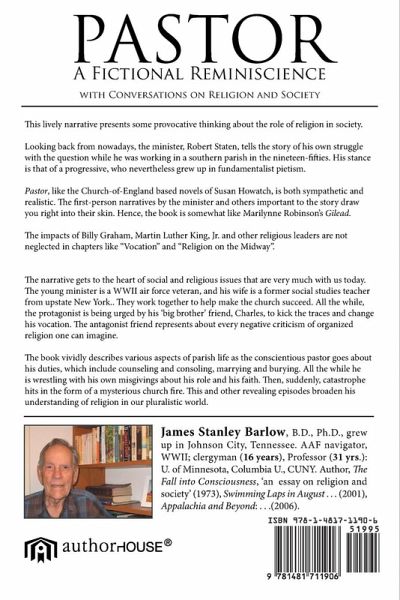 This lively narrative presents some provocative thinking about the role of religion in society. Looking back from nowadays, the minister, Robert Staten, tells the story of his own struggle with the question while he was working in a southern parish in the nineteen-fifties. His stance is that of a progressive, who nevertheless grew up in fundamentalist pietism. Pastor, like the Church-of-England based novels of Susan Howatch, is both sympathetic and realistic. The first-person narratives by the minister and others important to the story draw you right into their skin. Hence, the book is somewhat like Marilynne Robinson's Gilead. The impacts of Billy Graham, Martin Luther King, Jr. and other religious leaders are not neglected in chapters like "Vocation" and "Religion on the Midway". The narrative gets to the heart of social and religious issues that are very much with us today. The young minister is a WWII air force veteran, and his wife is a former social studies teacher from upstate New York.. They work together to help make the church succeed. All the while, the protagonist is being urged by his 'big brother' friend, Charles, to kick the traces and change his vocation. The antagonist friend represents about every negative criticism of organized religion one can imagine. The book vividly describes various aspects of parish life as the conscientious pastor goes about his duties, which include counseling and consoling, marrying and burying. All the while he is wrestling with his own misgivings about his role and his faith. Then, suddenly, catastrophe hits in the form of a mysterious church fire. This and other revealing episodes broaden his understanding of religion in our pluralistic world.