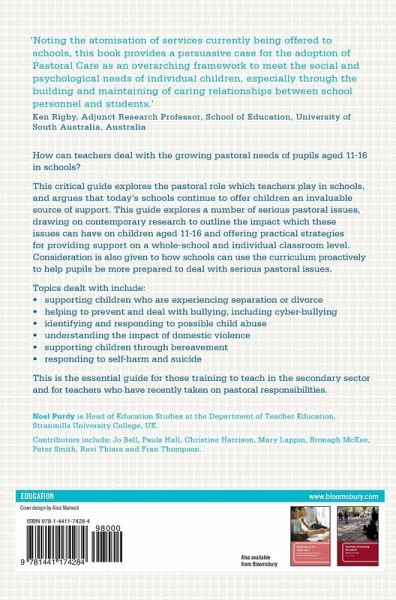 How can teachers deal with the growing pastoral needs of pupils aged 11-16 in schools? This critical guide explores the pastoral role which teachers play in schools, and argues that today's schools continue to offer children an invaluable source of support. This guide explores a number of serious pastoral issues, drawing on contemporary research to outline the impact which these issues can have on children aged 11-16 and offering practical strategies for providing support on a whole-school and individual classroom level. Consideration is also given to how schools can use the curriculum proactively to help pupils be more prepared to deal with serious pastoral issues. Topics dealt with include: - supporting children who are experiencing separation or divorce - helping to prevent and deal with bullying, including cyber-bullying - identifying and responding to possible child abuse - understanding the impact of domestic violence - supporting children through bereavement - responding to self-harm and suicide This is the essential guide for those training to teach in the secondary sector and for practicing teachers who have recently taken on pastoral responsibilities.