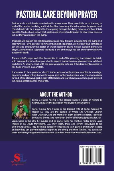 Sonja S. Frazier-Koenig is the blessed Nubian Queen of Richard B. Koenig. They are the parents of two awesome young men.Pastor Emma Jane Frazier is the blessed wife of Pastor George W. Frazier, Sr., they are the pastors of Whole Life Christian Church West-Outreach, and the mother of eight dynamic children. Together, Sonja and Emma Jane have been End-of-Life Doula/Specialist for 30+ years.Sonja is the CEO & Founder and co-owner with her mother, Pastor Emma Jane Frazier, of TX Doula Movement, LLC. They teach, train, and certify individuals to be End-of-Life Doulas. They also have a passion to teach and train pastors and church leaders on how they can provide holistic support to the dying and their families. You can reach them at carebeyond@txdoulamvmnt.com. Visit their website at www.txdoulamvmnt.com.