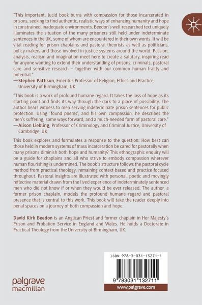 This book explores and formulates a response to the question: How best can those held in modern systems of mass incarceration be cared for pastorally when many prisons diminish both hope and humanity? Employing the multi-disciplinary approach of practical theology, this ethnographic enquiry will be a guide for chaplains and all who strive to embody compassion wherever human flourishing is undermined. The book's structure follows the pastoral cycle method from practical theology, remaining context-based and practice-focused throughout. Pastoral insights are illustrated with personal, poetic and movingly reflective material drawn from the lived experience of indeterminately sentenced men who did not know if or when they would be ever released. The author, a former prison chaplain, remains reflexively and humanely present in the text, modelling the profound humane regard and pastoral presence that is central to this work. This book will take the reader deeply into penal spaces on a journey of both compassion and hope.