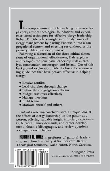 This comprehensive problem-solving reference for pastors provides theological foundations and experience-tested techniques for effective clergy leadership. Robert D. Dale offers insight into the dynamics of clergy management by placing leadership into a congregational context and stressing servanthood as the primary biblical leadership image. Following a discussion of the three critical dimensions of organizational effectiveness, Dale explores and critiques the four basic leadership styles: catalyst, commander, encourager, and hermit. Out of this background exploration, Dale discloses decision-making guidelines that have proved effective in helping clergy: resolve conflicts; lead churches through change; define the congregation's dream; budget resources effectively; manage meetings; build teams; and, motivate oneself and others. Pastoral Leadership concludes with a unique look at the effects of clergy leadership on the pastor as a person, offering valuable insight into clergy spirituality, burnout, family demands, and career development. Notes, a bibliography, and review questions accompany each chapter.