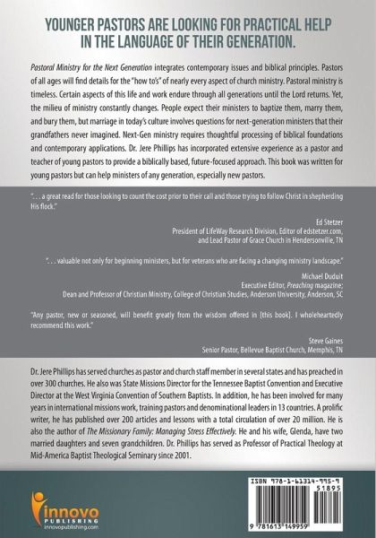 -ABOUT THE BOOK: Younger pastors are looking for practical help in the language of their generation. Pastoral Ministry for the Next Generation integrates contemporary issues and biblical principles. Pastors of all ages will find details for the "how to's" of nearly every aspect of church ministry. Pastoral ministry is timeless. Certain aspects of this life and work endure through all generations until the Lord returns. Yet, the milieu of ministry constantly changes. People expect their ministers to baptize them, marry them, and bury them, but marriage in today's culture involves questions for next-generation ministers that their grandfathers never imagined. Next-Gen ministry requires thoughtful processing of biblical foundations and contemporary applications. Dr. Jere Phillips has incorporated thirty years as pastor and over sixteen years of teaching young pastors to provide a biblically based, future-focused approach. This book was written for young pastors but can help ministers of any generation, especially new pastors. -ABOUT THE AUTHOR: Dr. Jere Phillips has served churches as pastor and church staff member in several states and has preached in over 300 churches. He also was State Missions Director for the Tennessee Baptist Convention and Executive Director at the West Virginia Convention of Southern Baptists. In addition, he has been involved for many years in international missions work, training pastors and denominational leaders in 13 countries. A prolific writer, he has published over 200 articles and lessons with a total circulation of over 20 million. He is also the author of The Missionary Family: Managing Stress Effectively. He and his wife, Glenda, have two married daughters and seven grandchildren. -ABOUT THE PUBLISHER: Innovo Publishing LLC is an independent publisher of Christian and wholesome titles, and is located near Memphis, TN. Since 2008, Innovo has published quality books, eBooks, audiobooks, music, screenplays, film, and online and physical curricula that support the Great Commission, equip believers, and help create a positive Christian worldview. Innovo's capabilities and global reach provide Christian authors, artists, and ministries access to the world for Christ. To learn more about Innovo Publishing, visit our website at innovopublishing.com. To connect with other Christian Creatives and to learn best practices for creating, publishing, marketing, and selling Christian titles, visit the Christian Publishing Portal at cpportal.com.