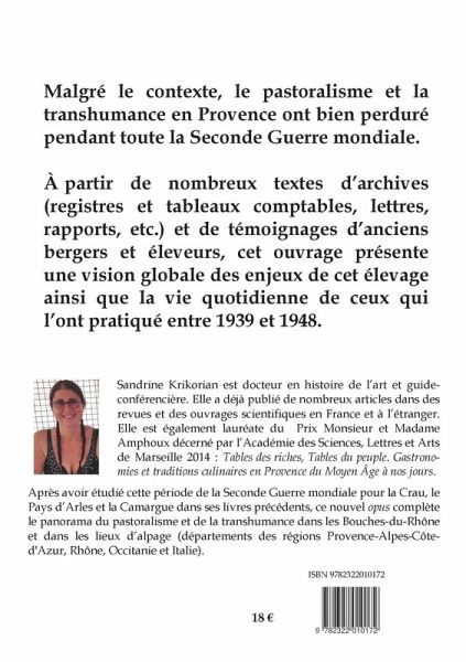 Malgré le contexte, le pastoralisme et la transhumance en Provence ont bien perduré pendant toute la Seconde Guerre mondiale. A partir de nombreux textes d'archives (registres et tableaux comptables, lettres, rapports, etc.) et de témoignages d'anciens bergers et éleveurs, cet ouvrage présente une vision globale des enjeux de cet élevage ainsi que la vie quotidienne de ceux qui l'ont pratiqué entre 1939 et 1948.