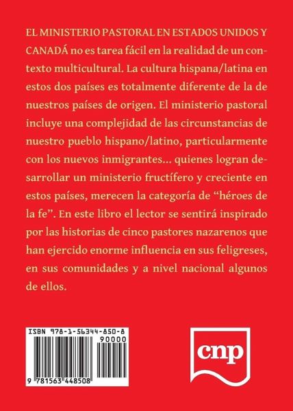 EL MINISTERIO PASTORAL EN ESTADOS UNIDOS Y CANADÁ no es tarea fácil en la realidad de un contexto multicultural. La cultura hispana/latina en estos dos países es totalmente diferente de la de nuestros países de origen. El ministerio pastoral incluye una complejidad de las circunstancias de nuestro pueblo hispano/latino, particularmente con los nuevos inmigrantes... quienes logran desarrollar un ministerio fructífero y creciente en estos países, merecen la categoría de "héroes de la fe". En este libro el lector se sentirá inspirado por las historias de cinco pastores nazarenos que han ejercido enorme influencia en sus feligreses, en sus comunidades y a nivel nacional algunos de ellos.
