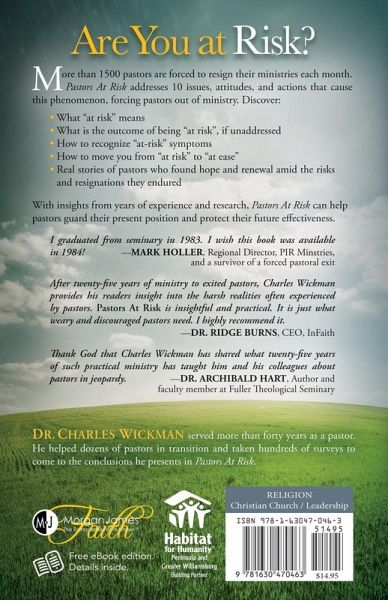 Nearly 1 in 4 pastors will experience a forced exit from ministry within their vocational tenure. Pastors-At-Risk will alert you to what attitudes and actions have put thousands of pastors at-risk of losing their position in the church. It includes testimonials, success stories and practical solutions for dealing with these issues. It offers a solution for restoration to those who have gone from a place of risk in the church to a transition in ministry.