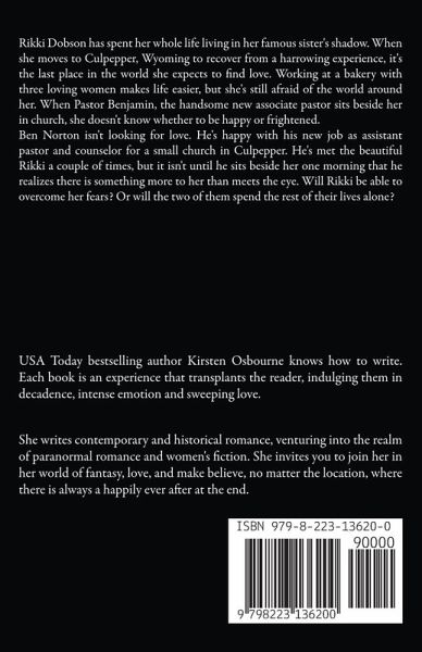 Rikki Dobson has spent her whole life living in her famous sister's shadow. When she moves to Culpepper, Wyoming to recover from a harrowing experience, it's the last place in the world she expects to find love. Working at a bakery with three loving women makes life easier, but she's still afraid of the world around her. When Pastor Benjamin, the handsome new associate pastor sits beside her in church, she doesn't know whether to be happy or frightened. Ben Norton isn't looking for love. He's happy with his new job as assistant pastor and counselor for a small church in Culpepper. He's met the beautiful Rikki a couple of times, but it isn't until he sits beside her one morning that he realizes there is something more to her than meets the eye. Will Rikki be able to overcome her fears? Or will the two of them spend the rest of their lives alone?