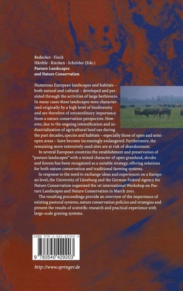 One of the main problems and aims of nature conservation in Europe is to protect semi-open landscapes. The development during the past decades is characterized by an ongoing intensivation of land use on the one hand, and an increasing number of former meadows and pastures lying fallow caused by changing economic conditions on the other hand. In several countries the estabishment of larger "pasture landscapes" with a mixed character of open grassland combined with shrubs and forests has been recognized as one solution to this problem. The book gives an overview of the European projects concerning to this topic - nature conservation policy and strategies, scientific results and practical experiences creating large scale grazing systems. TOC:Introduction.- Grazing as Phenomenon in Europe.- Grazing as a Nature Conservation Strategy.- Grazing and Habitat Dynamics - Results of Scientific Research.- Outlook.