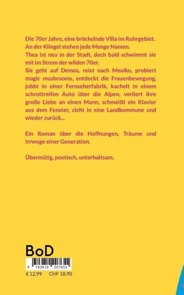 Die 70er Jahre, eine bröckelnde Villa im Ruhrgebiet. Thea ist neunzehn und neu in der Stadt. Sie kommt vom Land, doch jetzt will sie es wissen und bald schwimmt sie mit im Strom der wilden 70er. Sie geht auf Demos, reist nach Mexiko, probiert magic mushrooms, entdeckt die Frauenbewegung, jobbt in einer Fernseherfabrik, schmeißt ein Klavier aus dem Fenster, zieht in eine Landkommune und wieder zurück... Ein Roman über die Hoffnungen, Träume und Irrwege einer Generation. Übermütig, poetisch, unterhaltsam.
