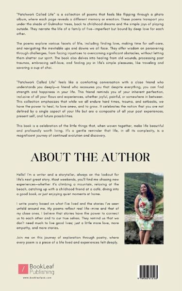 """"""Patchwork Called Life"""" is a collection of poems that feels like flipping through a photo album, where each page reveals a different memory or emotion. These poems transport you under the shade of Gulmohar trees, back to childhood dreams and the simple joys of playing outside. They narrate the life of a family of five-imperfect but bound by deep love for each other. The poems explore various facets of life, including finding love, making time for self-care, and navigating the inevitable ups and downs we all face. They offer wisdom on persevering through challenges, from facing injustices to overcoming significant obstacles, without letting them shatter our spirit. The book also delves into healing from old wounds, processing past traumas, embracing self-love, and finding joy in life's simple pleasures, like traveling and savoring a cup of chai. """"Patchwork Called Life"""" feels like a comforting conversation with a close friend who understands you deeply-a friend who reassures you that despite everything, you can find strength and happiness in your life. This friend reminds you of your inherent perfection, inclusive of all your flaws and experiences, whether joyful, painful, or somewhere in between. This collection emphasizes that while we all endure hard times, trauma, and setbacks, we have the power to heal, to love anew, and to grow. It celebrates the notion that you are not defined by a single aspect of your life but are a composite of all your past experiences, present self, and future possibilities. This book is a celebration of the little things that, when woven together, make life beautiful and profoundly worth living. It's a gentle reminder that life, in all its complexity, is a magnificent journey of continual evolution and discovery.""