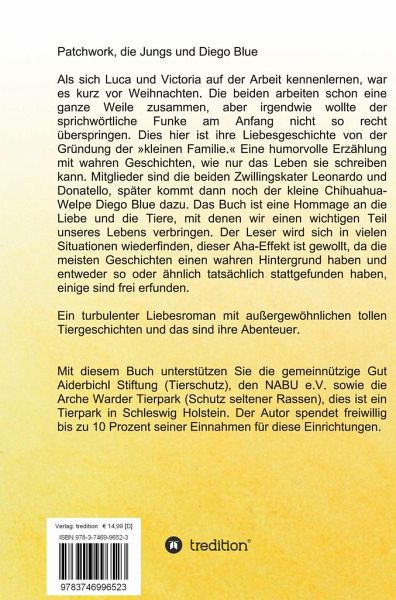 Dieser Liebesroman ist eine lustige, unterhaltsame und spannende Erzählung. Hauptfiguren sind Luca und Victoria, die roten Zwillingskater Leonardo und Donatello sowie der Welpe Diego Blue. Des Weiteren gibt es einige Nebenfiguren. Dieses Buch ist ein Liebesroman in dem Beziehungsthemen verarbeitet werden und ist auch für Tierfreunde geeignet, die sich in so mancher Episode mit einem Aha-Effekt wiederfinden werden. Dieses Buch ist eine positive Hommage an die Liebe und die Tiere, mit denen wir einen großen Teil unseres Lebens verbringen. Die meisten Geschichten haben so oder ähnlich tatsächlich stattgefunden, einige sind frei erfunden.