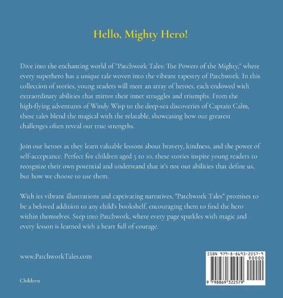 Welcome to "Patchwork Tales: The Powers of the Mighty," a collection of enchanting stories set in the magical town of Patchwork. Here, every child has a superpower that reflects both their greatest strength and their deepest challenge. Through engaging narratives and vivid illustrations, this book invites young readers to explore a world where differences are celebrated and challenges are met with courage and creativity. Meet characters like Windy Wisp, whose control over the wind mirrors her journey to find her voice, and Leap, who learns to innovate when his jumping powers vanish unexpectedly. From Captain Calm, who teaches the importance of staying composed under pressure, to Miracle Mirror, who helps her friends see their true worth, each story blends fantastical adventures with real-world lessons in empathy, resilience, and self-esteem. Designed for children aged 5 to 10, "Patchwork Tales" not only entertains with its whimsical plots and colorful characters but also empowers readers to face their own daily challenges with a renewed sense of bravery and self-acceptance. As the superheroes of Patchwork discover their inner strengths, they inspire children to recognize and celebrate their own unique qualities. Whether it's overcoming fears, learning the value of teamwork, or discovering that true power comes from within, "Patchwork Tales" offers a treasure trove of wisdom wrapped in the joy of storytelling. This book is an invitation to young readers to turn the page on adventure, find the superhero within, and light up their world with the powers of the mighty.
