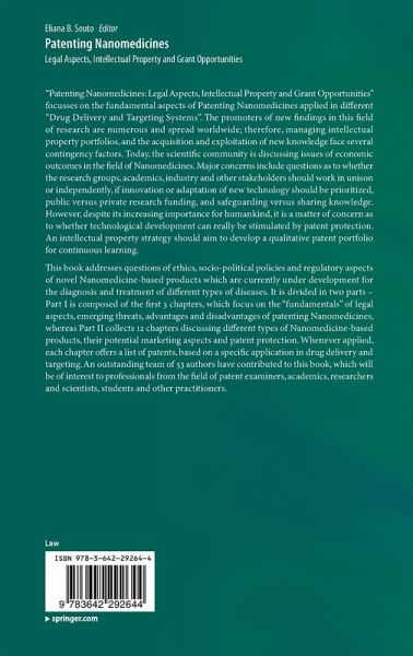 "Patenting Nanomedicines: Legal Aspects, Intellectual Property and Grant Opportunities" focusses on the fundamental aspects of Patenting Nanomedicines applied in different "Drug Delivery and Targeting Systems". The promoters of new findings in this field of research are numerous and spread worldwide; therefore, managing intellectual property portfolios, and the acquisition and exploitation of new knowledge face several contingency factors. Today, the scientific community is discussing issues of economic outcomes in the field of Nanomedicines. Major concerns include questions as to whether the research groups, academics, industry and other stakeholders should work in unison or independently, if innovation or adaptation of new technology should be prioritized, public versus private research funding, and safeguarding versus sharing knowledge. However, despite its increasing importance for humankind, it is a matter of concern as to whether technological development can really be stimulated by patent protection. An intellectual property strategy should aim to develop a qualitative patent portfolio for continuous learning.