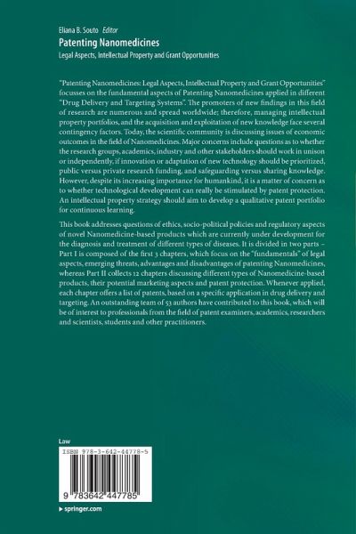 "Patenting Nanomedicines: Legal Aspects, Intellectual Property and Grant Opportunities" focusses on the fundamental aspects of Patenting Nanomedicines applied in different "Drug Delivery and Targeting Systems". The promoters of new findings in this field of research are numerous and spread worldwide; therefore, managing intellectual property portfolios, and the acquisition and exploitation of new knowledge face several contingency factors. Today, the scientific community is discussing issues of economic outcomes in the field of Nanomedicines. Major concerns include questions as to whether the research groups, academics, industry and other stakeholders should work in unison or independently, if innovation or adaptation of new technology should be prioritized, public versus private research funding, and safeguarding versus sharing knowledge. However, despite its increasing importance for humankind, it is a matter of concern as to whether technological development can really be stimulated by patent protection. An intellectual property strategy should aim to develop a qualitative patent portfolio for continuous learning.