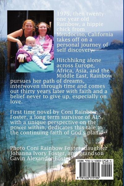 1975, then 21 year old Rainbow, a hippie chick from Mendocino California, takes off after a painful breakup. Begining in London, she hitchhikes alone across spaces in physical and emotional distance to find herself. First time novel by Coni Rainbow Foster, written over one year entirely with her chin as ALS, or Lou Gherigs disease has left her quadrapleqic. Touching tale of passion, longing, bravery, courage, and love.