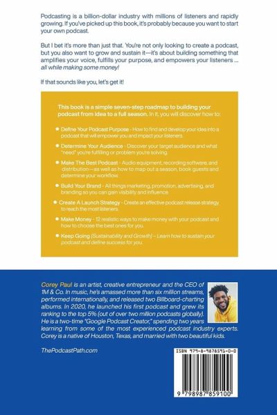 Are you looking to start a podcast, but feeling overwhelmed and unsure where to begin? Look no further than "Path to Podcast Success" - the ultimate guide to help you create, grow, and make money with your podcast. With a simple seven-step roadmap, this book will help you go from idea to a full season, no matter your level of experience! And the best part? Author Corey Paul knows what he's talking about. As a two-time "Google Podcast Creator," he spent two years learning from some of the most experienced podcast industry experts at Google and PRX, achieving tremendous success along the way. This includes:Growing listenership by 400% Ranking in the top 5% of podcasts globally Being rewarded more than $25,000 in the first two years. With "Path to Podcast Success," he's condensed all of that experience and knowledge into a comprehensive guide that anyone can follow. What You Will Learn? 1) Define Your Podcast Purpose How to find and develop your idea into a podcast that will empower you and impact your listeners. 2) Determine Your Audience Discover your target audience and what "need" you're fulfilling or problem you're solving. 3) Make the Best Podcast Audio equipment, recording software, and distribution-as well as how to map out a season, book guests and determine your workflow. 4) Build Your Brand All things marketing, promotion, advertising, and branding so you can gain visibility and influence. 5) Create a Launch Strategy Create an effective podcast release strategy to reach the most listeners. 6) Make Money 12 realistic ways to make money with your podcast and how to choose the best ones for you. 7) Keep Going Sustainability and Growth! Learn how to sustain your podcast and define success for you. Who Is This For? Whether you're looking to create a podcast to amplify your voice, fulfill your purpose, or empower your listeners (or all three!), this book has got you covered. With practical exercises, real-life examples, and research-backed advice, you'll learn how to develop your idea, create and launch your show, grow your listenership, and monetize your podcast. So, whether you're a beginner or an experienced podcaster looking to take your show to the next level, "Path to Podcast Success" is the guide you've been waiting for. Get ready to achieve your podcasting dreams and make a meaningful impact with your message.