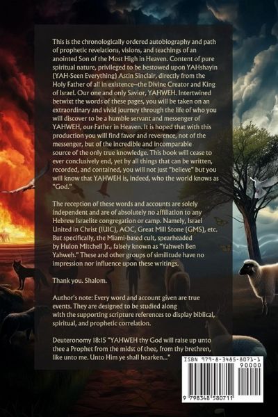 This is the chronologically ordered autobiography and path of prophetic revelations, visions, and teachings of an anointed Son of the Most High in Heaven. Content of pure spiritual nature, privileged to be bestowed upon YAHshayin (YAH-Seen Everything) Astin Sinclair, directly from the Holy Father of all in existence-the Divine Creator and King of Israel. Our one and only Savior, YAHWEH. Intertwined betwixt the words of these pages, you will be taken on an extraordinary and vivid journey through the life of who you will discover to be a humble servant and messenger of YAHWEH, our Father in Heaven. It is hoped that with this production you will find favor and reverence, not of the messenger, but of the incredible and incomparable source of the only true knowledge. This book will cease to ever conclusively end, yet by all things that can be written, recorded, and contained, you will not just "believe" but you will know that YAHWEH is, indeed, who the world knows as "God." The reception of these words and accounts are solely independent and are of absolutely no affiliation to any Hebrew Israelite congregation or camp. Namely, Israel United in Christ (IUIC), AOC, Great Mill Stone (GMS), etc. But specifically, the Miami-based cult, spearheaded by Hulon Mitchell Jr., falsely known as "Yahweh Ben Yahweh." These and other groups of similitude have no impression nor influence upon these writings. Thank you. Shalom. Author's note: Every word and account given are true events. They are designed to be studied along with the supporting scripture references to display biblical, spiritual, and prophetic correlation. Deuteronomy 18:15 "YAHWEH thy God will raise up unto thee a Prophet from the midst of thee, from thy brethren, like unto me. Unto Him ye shall hearken..."