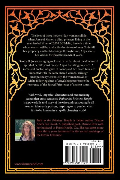 "An exquisitely rendered tale... A stunner of a book from a writer to watch." - The Prairie Book 5 Star Review Nov 2023"Dianne Adel's use of fantastical elements to reinforce the themes of the narrative hits the nail right on the head..." - Readers' Favorite 5 Star Review Nov 2023 When aging rock star, Scotty D. Jones sees a woman's face in the mirror that isn't hers, her already dysfunctional life starts to spiral even more out of control. Little does she know that Anya of Mahet, a High Priestess from 2000 BC sent her a vision from the past to invoke Scotty's part in a Prophecy set through time. In a chance meeting with Dr. Abigail DiGiorno, Scotty is shocked to discover they share the vision of the same face. When Scotty insists on finding out more, Abigail enlists the help of her niece Talia, who admits that she also has dreams of this ancient woman. They travel to the island of Malta to visit the earliest Temples of the Great Goddess, hoping for clarity. There, they each begin a journey that illuminates the Sacred Ways of the Great Design of the Divine teachings of the Ancient Priestesses of 2000 BC. This is a story about the true embodiment of the Sacred Feminine alive in all women. It's a story of remembering what can never be forgotten in the shifting times of patriarchal influence as we each claim our own revered Path to the Priestess Temple.
