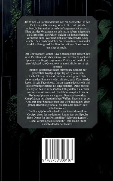 Im frühen 24. Jahrhundert hat sich die Menschheit in den Tiefen des Alls neu angesiedelt. Die Erde gilt als unbewohnbar und ist beinahe in Vergessenheit geraten. Ohne aus der Vergangenheit gelernt zu haben, wiederholt die Menschheit die Fehler, welche sie damals beinahe vernichtet hätte. Während sich ein verheerender Krieg zwischen den neu besiedelten Sternensystemen ausbreitet, wird der Untergrund der Gesellschaft von Gesetzlosen unsicher gemacht. Der Commander Connor Raven erkundet mit seiner Crew neue Planeten und Lebensräume. Auf der Suche nach den Spuren einer längst vergessenen Zivilisation entdeckt er eine Vielzahl von Orten, welche unwirklicher nicht sein könnten.Inmitten gesellschaftlicher Missstände beendet der gefürchtete Kopfgeldjäger Dylan Sykes einen Rachefeldzug. Beim Versuch, seinen eigenen Platz zwischen den Sternen wiederzufinden, gerät Commander Raven in sein Fadenkreuz. Ihn zu jagen jedoch, stellt sich als schwieriger heraus, als angenommen. Denn ebenso wie Dylan besitzt er besondere Fähigkeiten, die er sich nach einem Absturz und Überlebenskampf auf einem Dschungelplaneten aneignete. Darunter besondere Kampfkünste mit altertümlichen Waffen. Zudem ist er der Anführer einer Spezialeinheit und wird dadurch zu einer großen Bedrohung für alle, die ihm oder seiner Crew schaden wollen.Die Kampfpilotin Kaelyn Harper leistet derweil im Cockpit eines der modernsten Raumjäger der Epoche ihren Dienst für das Privatmilitär "Schwarze Legion". Dabei verschlägt es sie und ihr Team an die Front entscheidender Schlachten.