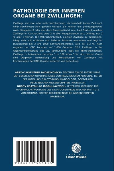Zwillinge sind zwei oder mehr Nachkommen, die innerhalb kurzer Zeit nach einer Schwangerschaft geboren werden. Sie können ein- (monozygotisch), zwei- (dizygotisch) oder mehrfach (polyzygotisch) sein. Laut Statistik machen Zwillinge im Durchschnitt etwa 2 % aller Neugeborenen aus, Drillinge nur 2 % aller Zwillinge. Die Wahrscheinlichkeit, eineiige Zwillinge zu bekommen, hängt nicht mit erblichen und äußeren Faktoren zusammen und liegt im Durchschnitt bei 3 pro 1000 Schwangerschaften, also bei 0,3 %. Nach Angaben der CDC kommen auf 1.000 Geburten 32,1 Zwillinge. In der Allgemeinbevölkerung des 21. Jahrhunderts liegt die Wahrscheinlichkeit, Zwillinge zu bekommen, bei etwa 3 zu 100 (etwa 3 %). Aus diesem Grund sind Diagnose, Behandlung und Rehabilitation von Zwillingen mit Erkrankungen der HNO-Organe weiterhin von Bedeutung.
