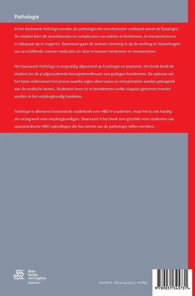 In het basiswerk Pathologie worden de pathologische verschijnselen verklaard vanuit de fysiologie. De student leert de verschijnselen en complicaties van ziekten te herkennen, te interpreteren en er adequaat op te reageren. Daarnaast wordt uitvoerig ingegaan op de werking en bijwerkingen van verschillende soorten medicatie om deze te kunnen herkennen en interpreteren.Het basiswerk Pathologie is zorgvuldig afgestemd op Medische fysiologie en anatomie. Het boek biedt de student (en de al afgestudeerde beroepsbeoefenaar) een gedegen basiskennis. De opbouw van het boek ondersteunt het proces waarbij eigen observaties en interpretaties worden gekoppeld aan de medische kennis. Studenten leren zo te beredeneren welke stappen genomen moeten worden in het verpleegkundig handelen.