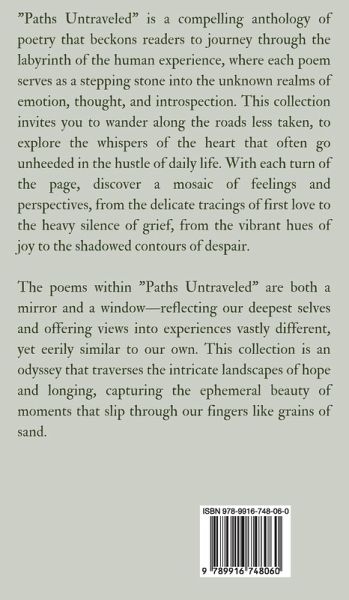 "Paths Untraveled" is a compelling anthology of poetry that beckons readers to journey through the labyrinth of the human experience, where each poem serves as a stepping stone into the unknown realms of emotion, thought, and introspection. This collection invites you to wander along the roads less taken, to explore the whispers of the heart that often go unheeded in the hustle of daily life. With each turn of the page, discover a mosaic of feelings and perspectives, from the delicate tracings of first love to the heavy silence of grief, from the vibrant hues of joy to the shadowed contours of despair. The poems within "Paths Untraveled" are both a mirror and a window-reflecting our deepest selves and offering views into experiences vastly different, yet eerily similar to our own. This collection is an odyssey that traverses the intricate landscapes of hope and longing, capturing the ephemeral beauty of moments that slip through our fingers like grains of sand. Copyright © 2024 Book Fairy Publishing