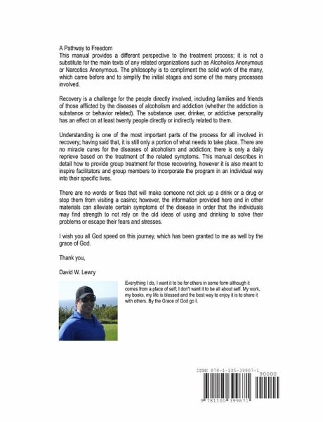 This manual provides a different perspective to the treatment process; it is not a substitute for the main texts of any related organizations such as Alcoholics Anonymous or Narcotics Anonymous. The philosophy is to compliment the solid work of the many, which came before and to simplify the initial stages and some of the many processes involved. Recovery is a challenge for the people directly involved, including families and friends of those afflicted by the diseases of alcoholism and addiction (whether the addiction is substance or behavior related). The substance user, drinker, or addictive personality has an effect on at least twenty people directly or indirectly related to them. I wish you all God speed on this journey, which has been granted to me as well by the grace of God. Thank you, David W. Lewry