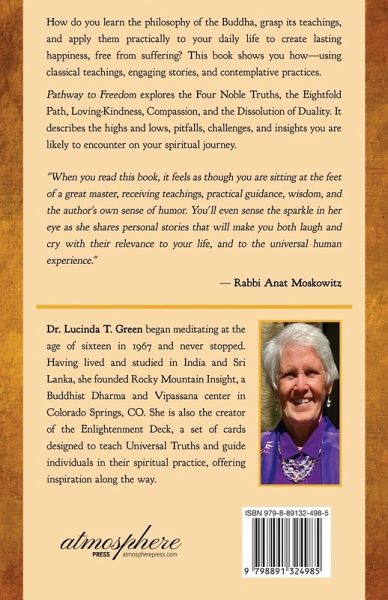 How do you learn the philosophy of the Buddha, grasp its teachings, and apply them practically to your daily life to create lasting happiness, free from suffering? This book shows you how-using classical teachings, engaging stories, and contemplative practices. Pathway to Freedom explores the Four Noble Truths, the Eightfold Path, Loving-Kindness, Compassion, and the Dissolution of Duality. It describes the highs and lows, pitfalls, challenges, and insights you are likely to encounter on your spiritual journey. "When you read this book, it feels as though you are sitting at the feet of a great master, receiving teachings, practical guidance, wisdom, and the author's own sense of humor. You'll even sense the sparkle in her eye as she shares personal stories that will make you both laugh and cry with their relevance to your life, and to the universal human experience." - Rabbi Anat Moskowitz --- Dr. Lucinda T. Green began meditating at the age of sixteen in 1967 and never stopped. Having lived and studied in India and Sri Lanka, she founded Rocky Mountain Insight, a Buddhist Dharma and Vipassana center in Colorado Springs, CO. She is also the creator of the Enlightenment Deck, a set of cards designed to teach Universal Truths and guide individuals in their spiritual practice, offering inspiration along the way.