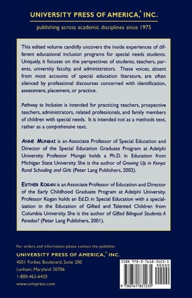 This edited volume candidly uncovers the inside experiences of different educational inclusion programs for special needs students. Uniquely, it focuses on the perspectives of students, teachers, parents, university faculty, and administrators. These voices, absent from most accounts of special education literature, are often silenced by professional discourses concerned with identification, assessment, placement, or practice. Pathway to Inclusion is intended for practicing teachers, prospective teachers, administrators, related professionals, and family members of children with special needs. It is intended not as a methods text, but rather a comprehensive text.