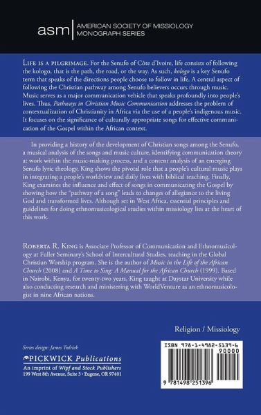 Life is a pilgrimage. For the Senufo of Cote d'Ivoire, life consists of following the kologo, that is the path, the road, or the way. As such, kologo is a key Senufo term that speaks of the directions people choose to follow in life. A central aspect of following the Christian pathway among Senufo believers occurs through music. Music serves as a major communication vehicle that speaks profoundly into the people's lives. Thus, Pathways in Christian Music Communication addresses the problem of contextualization of Christianity in Africa via the use of a people's indigenous music. It focuses on the significance of culturally appropriate songs for effective communication of the Gospel within the African context. In providing a history of the development of Christian songs among the Senufo, a musical analysis of the songs and music culture, identifying communication theory at work within the music-making process, and a content analysis of an emerging Senufo lyric theology, King shows the pivotal role that a people's cultural music plays in integrating a people's worldview and daily lives with biblical teaching. Finally, King examines the influence and effect of songs in communicating the Gospel by showing how the ""pathway of a song"" leads to changes of allegiance to the living God and transformed lives. Although set in West Africa, essential principles and guidelines for doing ethnomusicological studies within missiology lies at the heart of this work.
