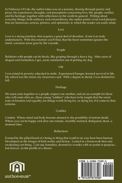 In Pathways Of Life, the author takes you on a journey, sharing, through poetry and prose, his experiences, thoughts, and perceptions concerning love, life, people, war, and his heritage; together with reflections on the world in general. Says the author: "If the reader, as he or she moves through the material, will stop occasionally and reflect on their own experiences, nearly everyone should find at least one item to which they can relate during their journey along the Pathways Of Life.