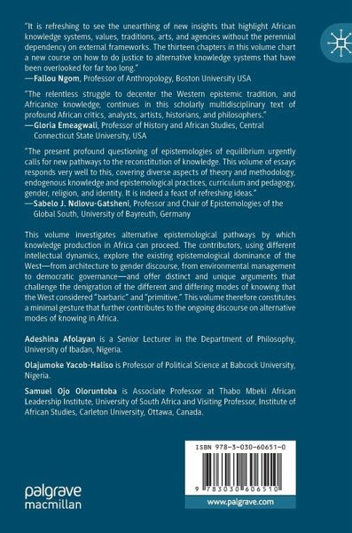 This volume investigates alternative epistemological pathways by which knowledge production in Africa can proceed. The contributors, using different intellectual dynamics, explore the existing epistemological dominance of the West-from architecture to gender discourse, from environmental management to democratic governance-and offer distinct and unique arguments that challenge the denigration of the different and differing modes of knowing that the West considered "barbaric" and "primitive." This volume therefore constitutes a minimal gesture that further contributes to the ongoing discourse on alternative modes of knowing in Africa.