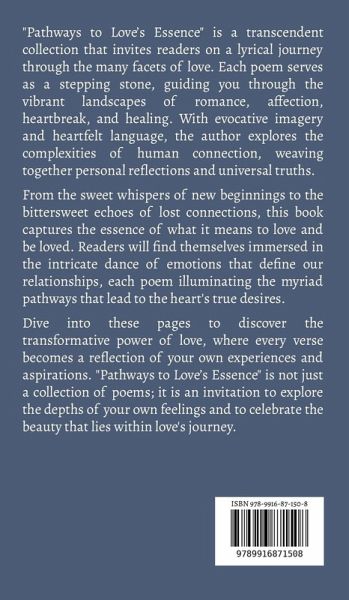 "Pathways to Love's Essence" is a transcendent collection that invites readers on a lyrical journey through the many facets of love. Each poem serves as a stepping stone, guiding you through the vibrant landscapes of romance, affection, heartbreak, and healing. With evocative imagery and heartfelt language, the author explores the complexities of human connection, weaving together personal reflections and universal truths. From the sweet whispers of new beginnings to the bittersweet echoes of lost connections, this book captures the essence of what it means to love and be loved. Readers will find themselves immersed in the intricate dance of emotions that define our relationships, each poem illuminating the myriad pathways that lead to the heart's true desires. Dive into these pages to discover the transformative power of love, where every verse becomes a reflection of your own experiences and aspirations. "Pathways to Love's Essence" is not just a collection of poems; it is an invitation to explore the depths of your own feelings and to celebrate the beauty that lies within love's journey.