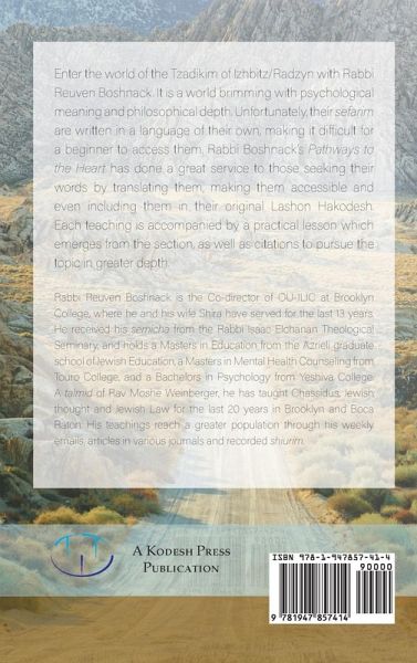 Enter the world of the Tzadikim of Izhbitz/Radzyn with Rabbi Reuven Boshnack. It is a world brimming with psychological meaning and philosophical depth. Unfortunately, their sefarim are written in a language of their own, making it difficult for a beginner to access them. Rabbi Boshnack's Pathways to the Heart has done a great service to those seeking their words by translating them, making them accessible and also including them in their original Lashon Hakodesh. Each teaching is accompanied by a practical lesson to incorporate into your daily life, as well as citations to pursue the topic in greater depth. A fascinating and groundbreaking way to be able to access these profound ideas - for all. Rabbi Reuven Boshnack is the Co-director of OU-JLIC at Brooklyn College, where he and his wife Shira have served the community of students, alumni and friends for the last 13 years. He received his semicha from the Rabbi Isaac Elchonon Theological Seminary, and holds a Masters in Education from the Azrieli graduate school of Jewish Education, a Masters in Mental Health Counseling from Touro College, and a Bachelors in Psychology from Yeshiva College. A talmid of Rav Moshe Weinberger, he has taught Chassidus, Jewish thought and Jewish Law for the last 20 years in Brooklyn, Boca Raton. His teachings reach a greater population through his weekly emails, articles in various journals and recorded Shiurim.