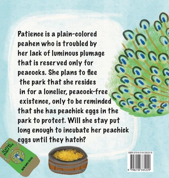 Patience is a plain-colored peahen who is troubled by her lack of luminous plumage that is reserved only for peacocks. She plans to flee the park that she resides in for a lonelier, peacock-free existence, only to be reminded that she has peachick eggs in the park to protect. Will she stay put long enough to incubate her peachick eggs until they hatch?