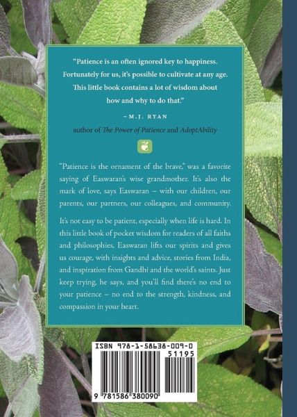 This little book of wisdom is full of insights and advice from one of the twentieth century's great spiritual teachers. "Patience is the ornament of the brave," Eknath Easwaran's wise grandmother used to say. Patience is also the mark of love, says Easwaran - with our children, our parents, our partners, our colleagues, and our communities. Easwaran is one of the twentieth century's great spiritual teachers and an authentic guide to timeless wisdom. In this little book, Easwaran lifts our spirits and gives us courage, with insights and advice, stories, and inspiration from the world's saints and sages. Just keep trying, Easwaran says, and you'll find there's no end to your patience ? no end to the wisdom, love, and compassion in your heart.