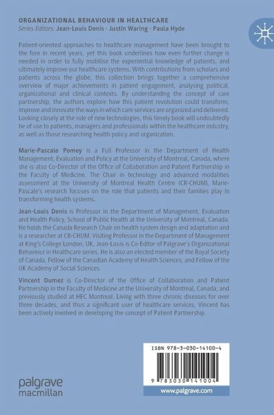 Marie-Pascale Pomey is a Full Professor in the Department of Health Management, Evaluation and Policy at the University of Montreal, Canada, where she is also Co-Director of the Office of Collaboration and Patient Partnership in the Faculty of Medicine. The Chair in technology and advanced modalities assessment at the University of Montreal Health Centre (CR-CHUM), Marie-Pascale's research focuses on the role that patients and their families play in transforming health systems. Jean-Louis Denis is Professor in the Department of Management, Evaluation and Health Policy, School of Public Health at the University of Montreal, Canada. He holds the Canada Research Chair on health system design and adaptation and is a researcher at CR-CHUM. Visiting Professor in the Department of Management at King's College London, UK, Jean-Louis is Co-Editor of Palgrave's Organizational Behaviour in Healthcare series. He is also an elected member of the Royal Society of Canada, Fellow of the Canadian Academy of Health Sciences, and Fellow of the UK Academy of Social Sciences. Vincent Dumez is Co-Director of the Office of Collaboration and Patient Partnership in the Faculty of Medicine at the University of Montreal, Canada, and previously studied at HEC Montreal. Living with three chronic diseases for over three decades, and thus a significant user of healthcare services, Vincent has been actively involved in developing the concept of Patient Partnership.