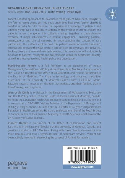 Marie-Pascale Pomey is a Full Professor in the Department of Health Management, Evaluation and Policy at the University of Montreal, Canada, where she is also Co-Director of the Office of Collaboration and Patient Partnership in the Faculty of Medicine. The Chair in technology and advanced modalities assessment at the University of Montreal Health Centre (CR-CHUM), Marie-Pascale's research focuses on the role that patients and their families play in transforming health systems. Jean-Louis Denis is Professor in the Department of Management, Evaluation and Health Policy, School of Public Health at the University of Montreal, Canada. He holds the Canada Research Chair on health system design and adaptation and is a researcher at CR-CHUM. Visiting Professor in the Department of Management at King's College London, UK, Jean-Louis is Co-Editor of Palgrave's Organizational Behaviour in Healthcare series. He is also an elected member of the Royal Society of Canada, Fellow of the Canadian Academy of Health Sciences, and Fellow of the UK Academy of Social Sciences. Vincent Dumez is Co-Director of the Office of Collaboration and Patient Partnership in the Faculty of Medicine at the University of Montreal, Canada, and previously studied at HEC Montreal. Living with three chronic diseases for over three decades, and thus a significant user of healthcare services, Vincent has been actively involved in developing the concept of Patient Partnership.