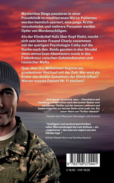 Mysteriöse Dinge passieren in einer Privatklinik im mediterranen Nizza: Patienten werden heimlich operiert, eine junge Ärztin verschwindet und mehrere Personen werden Opfer von Mordanschlägen.Als der Klinikchef Hals über Kopf flieht, macht sich sein bester Freund Charly zusammen mit der quirligen Psychologin Cathy auf die Suche nach ihm. Beide geraten in den Strudel eines amourösen Abenteuers sowie in das Fadenkreuz zwischen Geheimdiensten und russischer Mafia.Quer über das Mittelmeer beginnt ein gnadenloser Wettlauf mit der Zeit. Wer wird als Erster das dunkle Geheimnis der Klinik lüften? Warum musste Patient Nr. 11 sterben?