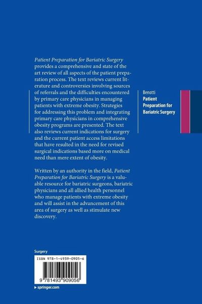 Written by an authority in the field, Patient Preparation for Bariatric Surgery is a valuable resource for bariatric surgeons, bariatric physicians and all allied health personnel who manage patients with extreme obesity and will assist in the advancement of this area of surgery as well as stimulate newdiscovery.