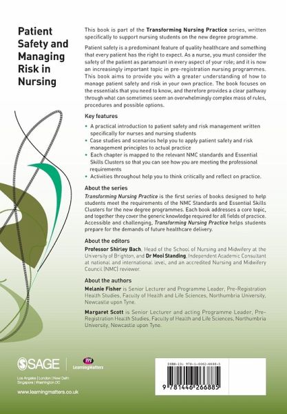 Patient safety is a predominant feature of quality healthcare and something that every patient has the right to expect. As a nurse, you must consider the safety of the patient as paramount in every aspect of your role; and it is now an increasingly important topic in pre-registration nursing programmes. This book aims to provide you with a greater understanding of how to manage patient safety and risk in your practice. The book focuses on the essentials that you need to know, and therefore provides a clear pathway through what can sometimes seem an overwhelmingly complex mass of rules, procedures and possible options.