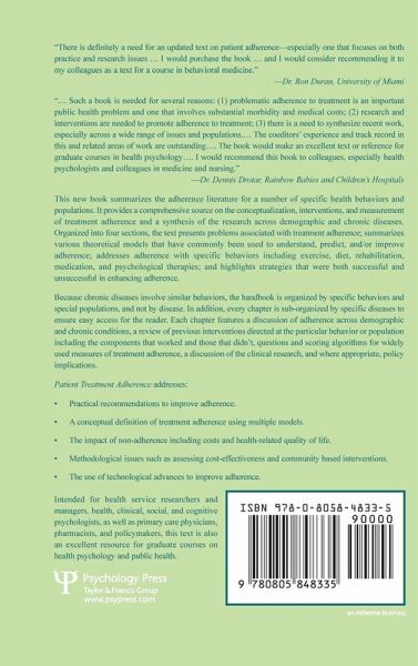 This new book provides a comprehensive source on the conceptualization, interventions, and measurement of treatment adherence and on the research across demographic and chronic diseases. The text presents problems associated with treatment adherence; the