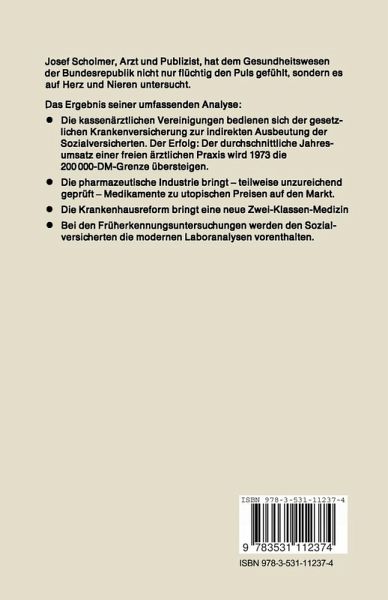 Einführung.- 1. Die gesetzliche Krankenversicherung.- 1.1. Die Struktur des gesetzlichen Krankenversicherungswesens.- 1.2. Die Beitragsgestaltungen der gesetzlichen Kranken-versicherungen.- 1.3. Die Explosion der Kosten in der GKV und ihre Ursachen.- 2. Reformprobleme der gesetzlichen Krankenversicherung.- 2.1. Kritik des gegenwärtigen Krankenversicherungssystems.- 2.2. Regionale Neugliederungen bei den AOK.- 2.3. Plädoyer für die Einheitsversicherung.- 3. Das Geschäft der Ärzte mit der Krankheit.- 3.1. Das Einkommen der Ärzte.- 3.2. Maßnahmen zur Erschließung neuer Pfründe.- 3.3. Die Sicherung der Einkommenshöhe.- 3.4. Das Geschäft mit den medizinisch-technischen Leistungen.- 3.5. Weitere Versuche, Privilegien zu sichern.- 3.6. Die Normalisierung der Arzthonorare.- 4. Der Arzneimittelmarkt in der Bundesrepublik.- 4.1. Medikamente als Kostenfaktor der gesetzlichen Kranken-versicherung.- 4.2. Das Arzneimittelangebot.- 4.3. Die Struktur des Arzneimittelmarktes.- 4.4. Die pharmazeutische Industrie und das Geschäft mit der Krankheit.- 4.5. Der pharmazeutische Großhandel im Geschäft mit der Krankheit.- 4.6. Die Apotheken und das Geschäft mit der Krankheit.- 4.7. Arzneimittelmißbrauch.- 4.8. Zur Novellierung des Arzneimittelrechts.- 4.9. Reformen bei den Arzneimittelpreisen.- 5. Krankenhausreform.- 5.1. Das Hanauer Modell des klassenlosen Krankenhauses.- 5.2. Die Situation des Krankenhauswesens in der BRD.- 5.3. Kritik des Krankenhauswesens in der Bundesrepublik.- 5.4. Die neue Bundespflegesatzverordnung und ihre Auswirkungen: Stückwerk statt Reformen.- 6. Probleme der Vorsorgeuntersuchungen.- 6.1. Die gesetzliche Regelung der Vorsorgeuntersuchungen.- 6.2. Die Unzulänglichkeit der Vorsorgemaßnahmen.- 6.3. Die geringe Inanspruchnahme derVorsorgeuntersuchungen und ihre Gründe.- 6.4. Kritik der praktizierten Vorsorgeuntersuchungen.- 6.5. Eine Krebs-Statistik.- 6.6. Die Unzulänglichkeit der Früherkennung- Untersuchungen bei Kindern.- 6.7. Ein Modell für effektivere Vorsorgeuntersuchungen und seine Erfahrungen.- 7. Was denkt die junge Ärztegeneration?.- 7.1. Zwei Meinungsumfragen unter jungen Medizinern.- 7.2. Vorstellungen zur künftigen ambulanten Versorgung.- 7.3. Meinungen zur Krankenhausreform.- 7.4. Für ein neues Verhältnis zwischen Arzt und Patient.- 7.5. Zur Situation im Arzneimittelwesen.- 7.6. Die jungen Mediziner zwischen Ethos und Einkommen.- 8. Die Gesundheitspolitik der Parteien.- 8.1. Gesundheitspolitik in der Bundesrepublik - ärztliche Interessenvertretung.- 8.2. Die Vernachlässigung der Sozialversicherten.- 8.3. Neue Tendenzen in der SPD.- 9. Gedanken zu einer freiheitlichen Gesellschafts- und Gesundheitspolitik.- 9.1. Der Begriff der Freiheit.- 9.2. Gerechtigkeit und Solidarität in der neuen Gesellschaft.- 9.3. Sozialistische Zukunft und freie Gesellschaft.- Anmerkungen zu den Kapiteln 1-9.- Tabellarischer Teil.- Dokumentarischer Teil..