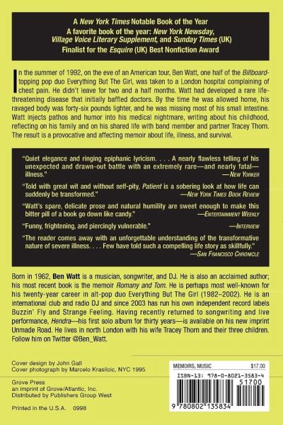 In the summer of 1992, on the eve of an American tour, Ben Watt, one half of British pop duo Everything But The Girl, was taken into a London hospital complaining of chest pain. He didn't leave for two and a half months. Still only twenty-nine, Watt had developed a rare life-threatening disease that initially baffled doctors. He needed two months of hospital treatment and four risky operations to remove dead internal tissue before the condition was stabilized. By the time he was allowed home, his ravaged body was forty-six pounds lighter, and he was missing most of his small intestine. But Patient is more than a diary of Watt's hospital days. As he awakens bewildered and disoriented in a hospital bed between bouts of surgery, Watt injects pathos and humor into his medical nightmare, writing about his childhood and reflecting on his family and on his shared life with bandmember and partner Tracey Thorn. The result is a provocative and affecting memoir about life, illness, and survival.