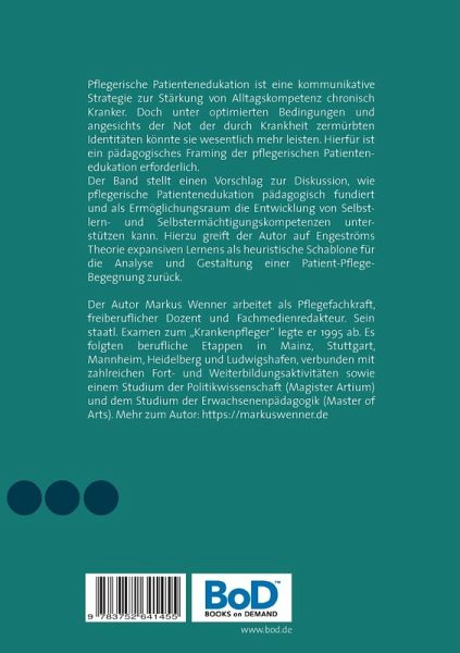 Pflegerische Patientenedukation ist eine kommunikative Strategie zur Stärkung von Alltagskompetenz chronisch Kranker. Doch unter optimierten Bedingungen und angesichts der Not der durch Krankheit zermürbten Identitäten könnte sie wesentlich mehr leisten. Hierfür ist ein pädagogisches Framing der pflegerischen Patientenedukation erforderlich.Der Band stellt einen Vorschlag zur Diskussion, wie pflegerische Patientenedukation pädagogisch fundiert und als Ermöglichungsraum die Entwicklung von Selbstlern- und Selbstermächtigungskompetenzen unterstützen kann. Hierzu greift der Autor auf Engeströms Theorie expansiven Lernens als heuristische Schablone für die Analyse und Gestaltung einer Patient-Pflege-Begegnung zurück.