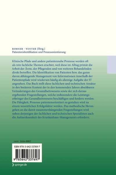 Patientenidentifikation ein Beitrag zur integrierten und prozessorientierten Versorgung.- Patientenidentifikation und Prozessorientierung Problemstellung und Grundlagen.- Business Engineering betriebswirtschaftliche Konstruktionslehre und ihre Anwendung im Gesundheitswesen.- Patientenidentifikation im Krankenhaus Strategie und Vision einer prozessorientierten Patientenidentifikation.- Patientenidentifikation im Krankenhaus von der Strategie zur Umsetzung, klinische Prozesse und Patientenidentitäten.- Von der Strategie zur Umsetzung Unterstützungsprozesse und Identitätsmanagement im Krankenhaus.- Methodisches Vorgehen als Grundlage für die systematische Umsetzung der Patientenidentifikation Ziele, Aufgaben, Projekte und Ergebnisse aus Sicht des Krankenhauses.- Rahmenbedingungen, Ansätze und Nutzen der eindeutige Patientenidentifikation in der Schweiz.- Chancen und Herausforderungen einer vernetzten Patientenidentifikation.- Digitale Langzeitdatenhaltung und Patientenidentifikation.- Überblick technischer und konzeptioneller Grundlagen einer prozessorientierten Patientenidentifikation.