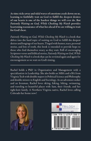 As time ticks away and tidal waves of emotions crash down on us, learning to faithfully wait on God to fulfill the deepest desires of our hearts is one of the hardest things we will ever do. But Patiently Waiting on God, While Checking My Watch provides heartening reassurance of what lies ahead if we are willing to wait for God's best. Patiently Waiting on God, While Checking My Watch is a book that delves into the hard topic of waiting on God to fulfill the deepest desires and longings of our hearts. Tinged with humor, tears, personal stories, and lots of truth, this book is intended to provide hope to those who find themselves weary as they wait. Full of encouraging Scriptures verses and biblical stories, Patiently Waiting on God, While Checking My Watch is a book that can be revisited again and again for encouragement as we wait on God's timing.