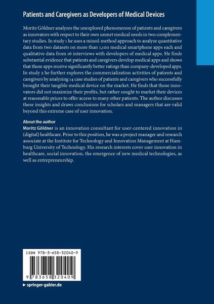 Moritz Göldner analyzes the unexplored phenomenon of patients and caregivers as innovators with respect to their own unmet medical needs in two complementary studies. In study 1 he uses a mixed-method approach to analyze quantitative data from two datasets on more than 1,100 medical smartphone apps each and qualitative data from 16 interviews with developers of medical apps. He finds substantial evidence that patients and caregivers develop medical apps and shows that those apps receive significantly better ratings than company-developed apps. In study 2 he further explores the commercialization activities of patients and caregivers by analyzing 14 case studies of patients and caregivers who successfully brought their tangible medical device on the market. He finds that those innovators did not maximize their profits, but rather sought to market their devices at reasonable prices to offer access to many other patients. The author discusses these insights and draws conclusionsfor scholars and managers that are valid beyond this extreme case of user innovation.